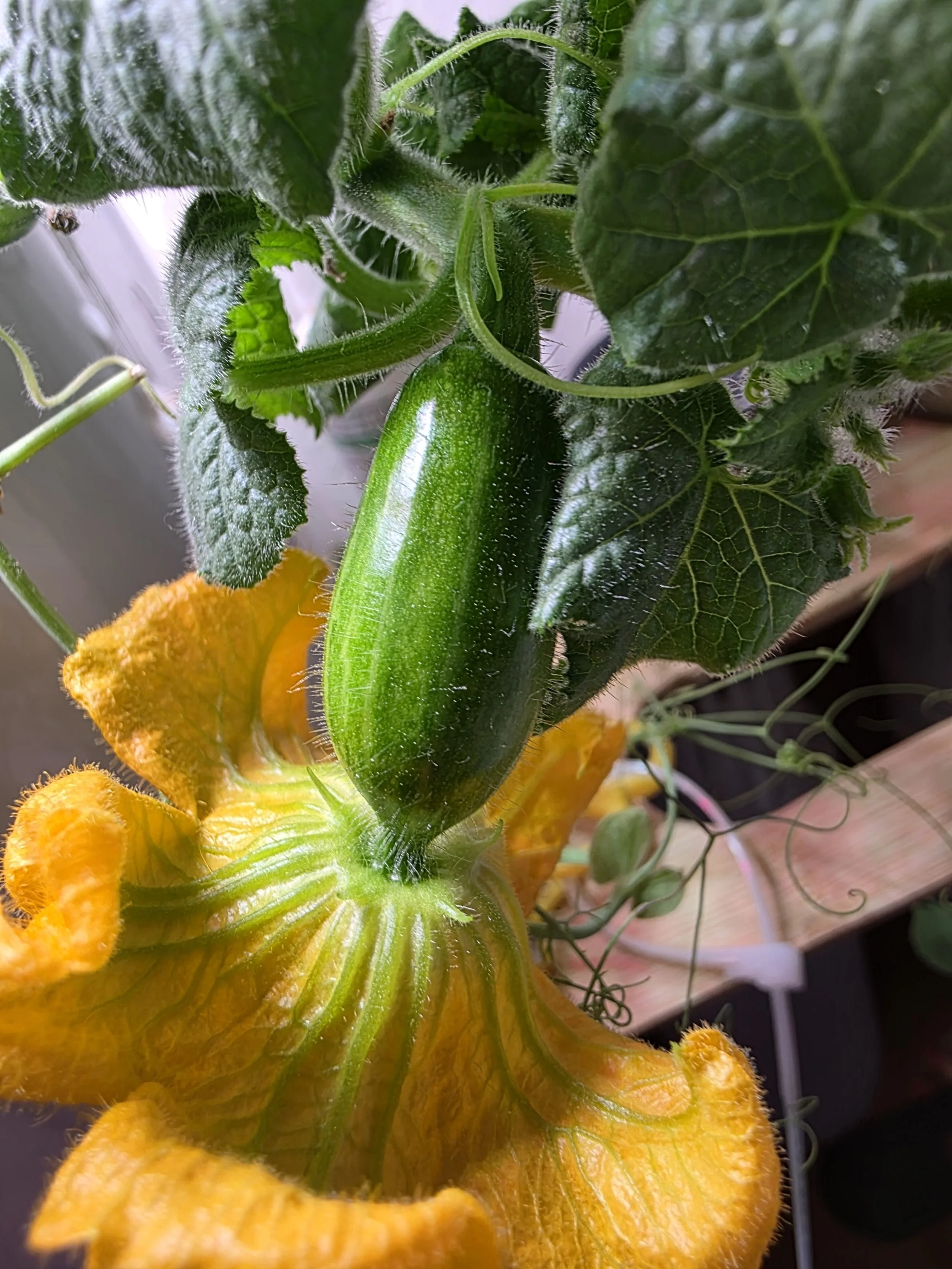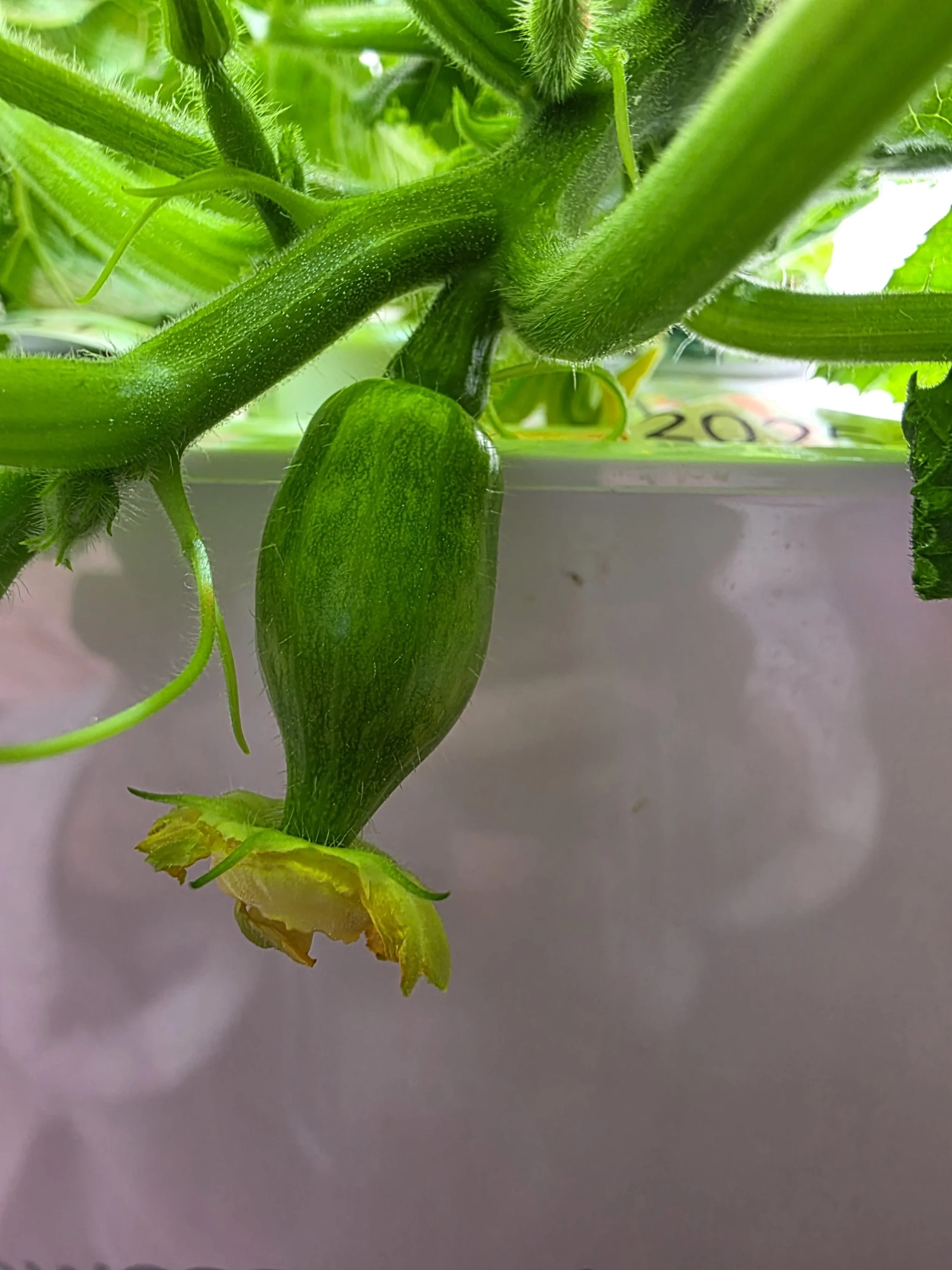 The baby squash formed before its female flower opened. I ate it on Christmas Eve ( +/-1 1/2” long, delicious and 4 more on the way).