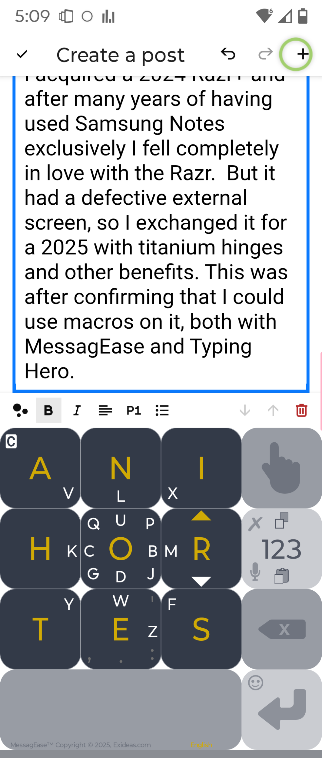 I acquired a 2024 Razr+ and after many years of having used Samsung Notes exclusively I fell completely in love with the Razr. But it had a defective external screen, so I exchanged it for a 2025 with titanium hinges and other benefits. This was after confirming that I could use macros on it, both with MessagEase and Typing Hero.